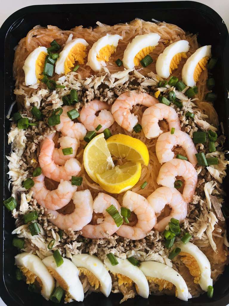 Filipino noodle dish topped with shrimp gravy, shrimp, smoked fish flakes, pork cracklings, and eggs